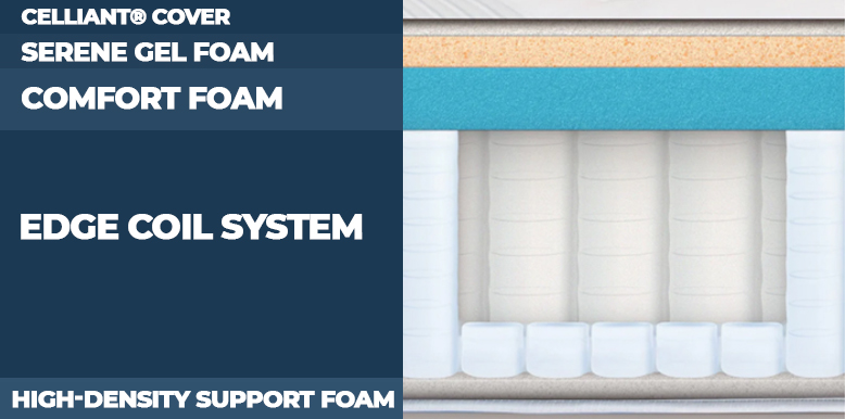 - Below the cover is a cooling, Serene Gel Foam that’s 2 inches thick and is quilted into the top for a plush feel.