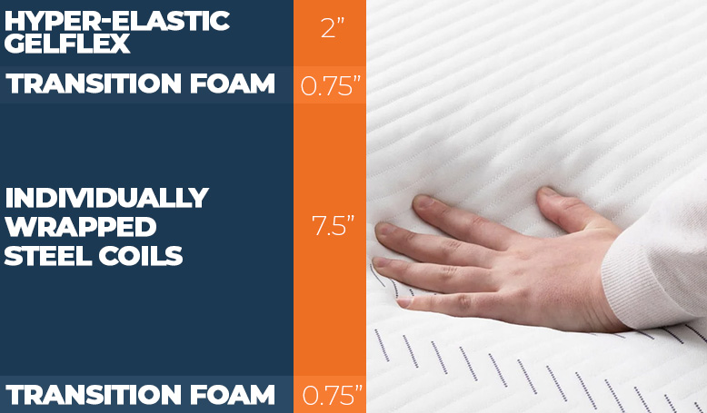 - Further down, you’ll find a .75-inch layer of transition foam to help you ease into the support layer below.