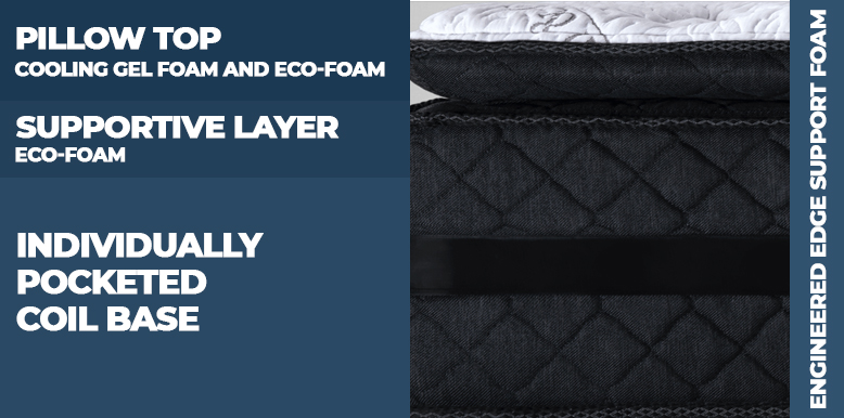 - The first layer is a 3-inch pillow top that starts with a Tencel® cover made with breathable eucalyptus fibers. The inside of the pillow top contains a silk blend for a smoother, softer feel, while the rest of the pillow top holds an inch of cooling gel foam for temperature regulation and Eco-Foam for pressure relief.