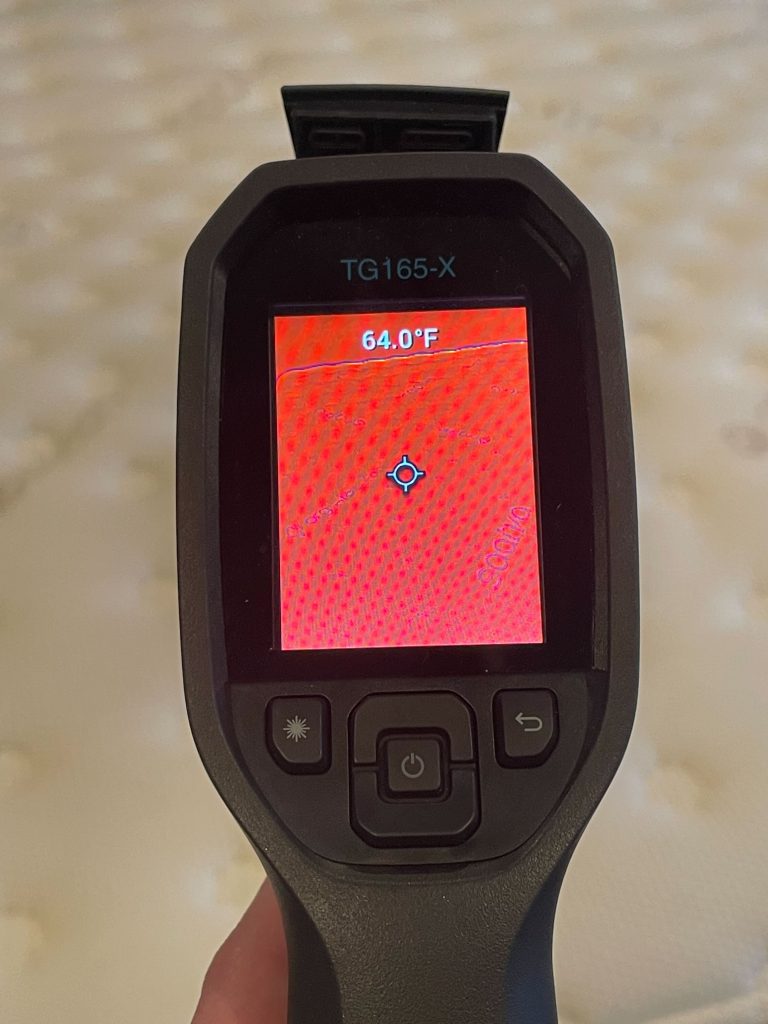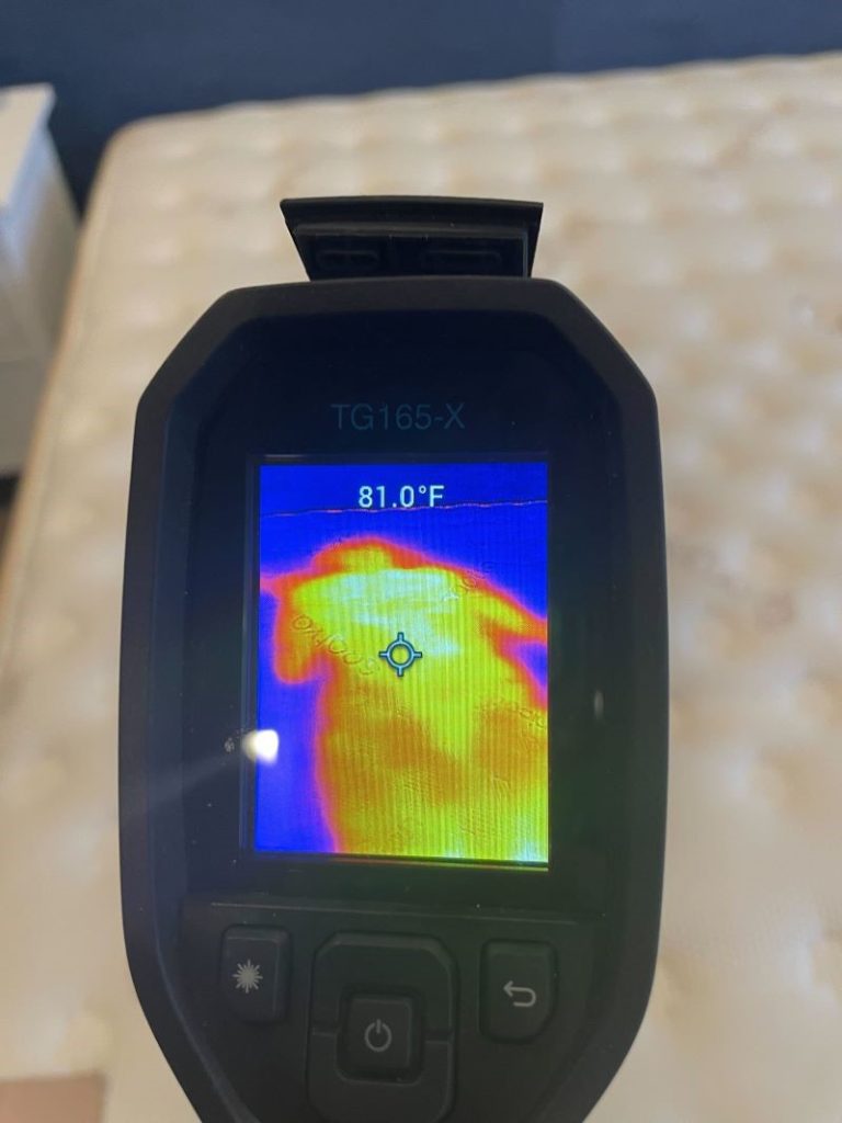 As part of my cooling test, I used a temperature gun to see how the mattress’s temperature changed in real time. In the first image on the left, you can see the starting temperature before I got on the mattress, which was 64 degrees. The second image is what the temperature was after lying on the bed for five minutes. The third image on the right is what the temperature was after lying on the Saatva for another five minutes, which was 81 degrees.