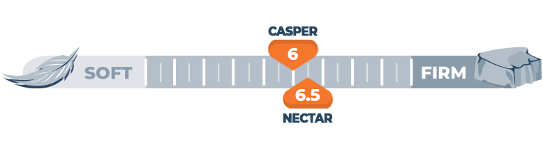Both mattresses score within a very similar firmness range on our scale that measures from 1 to 10, with 1 being the softest and 10 being the firmest. Casper comes in at a 6, and Nectar is a 6.5. These are versatile medium-firm scores that usually indicate mattress designs that can accommodate a range of different preferences and needs.