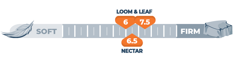 Our scoring system evaluates mattress firmness on a scale where 1 is the softest and 10 is the firmest (if you’re not completely sure how that works here’s our firmness guide and a chart that we use). Nectar and Loom & Leaf’s Relaxed Firm version fall right within the same Medium range, with scores of 6.5 and 6, respectively. Mattresses within this range usually appeal to combination sleepers who alternate between positions because they can accommodate your body while sleeping on your side, stomach, or back.