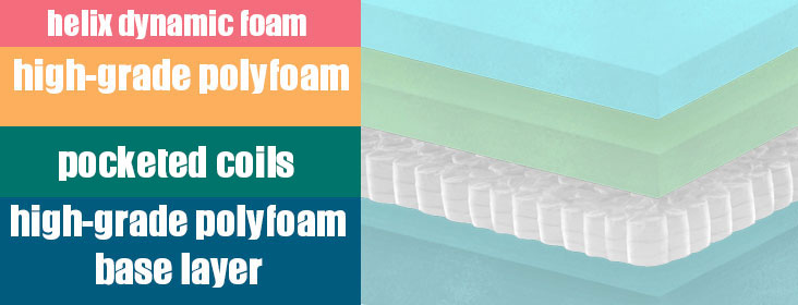 - The first layer uses Helix Dynamic Foam, a latex hybrid that should provide some contouring, a little bounce, and some airflow.