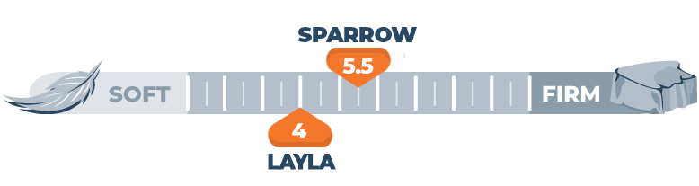 We rate firmness on a scale from 1 to 10 with a ten being the firmest. Layla’s Medium-Soft firmness rates at a 4 while the Sparrow scores between a 5.5.