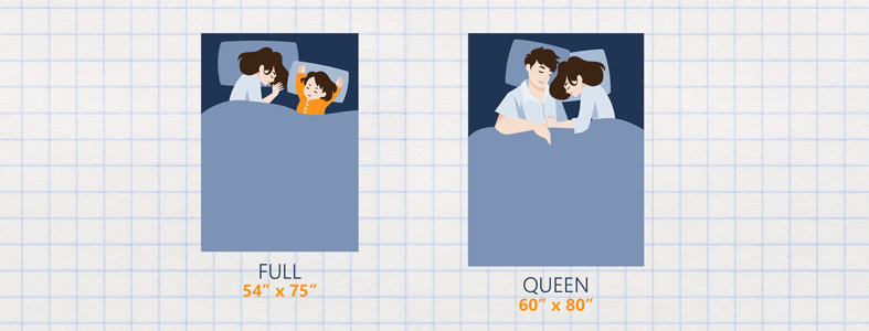 As you can see from the comparison chart, a Full-size bed measures 54 inches by 75 inches while the Queen size measures 60 inches by 80 inches. Since the Queen offers more length and width, it’s usually the better of the two for couples.