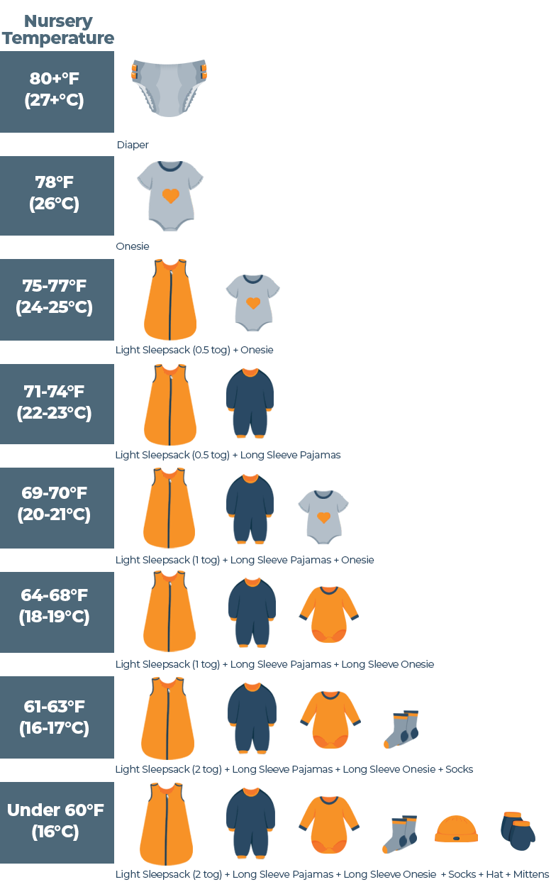 Knowing the appropriate clothing for your baby based on the temperature of their room can feel tricky, which is why we’ve drawn up a chart for easy reference. Have a look below when you’re concerned about sleepwear and room temperature so your baby can be dressed appropriately.